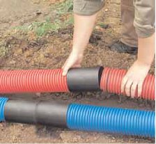 - Стыковка труб производится посредством соединительных муфт. Для герметизации стыка используется уплотнительное кольцо. В качестве альтернативного метода стыковки можно использовать термоусадочную трубку (ТУТ). Зачастую необходимо применять заглушки для избежания попадания воды и мусора внутрь трубы.