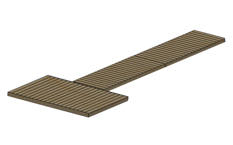 Причал - это инженерное сооружение состоящее из настилов поддерживаемых на воде пластиковыми модулями плавучести (понтонами). Основание настила выполнено из высококачественной древесины обработанной специальными средствами, предотвращающими гниение. Верх настила - террасная доска (специальный материал применяемый при строительстве гидротехнических сооружений).